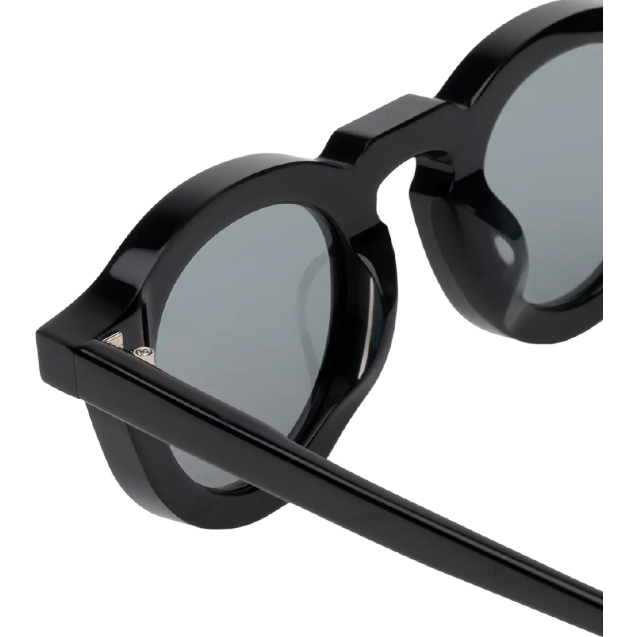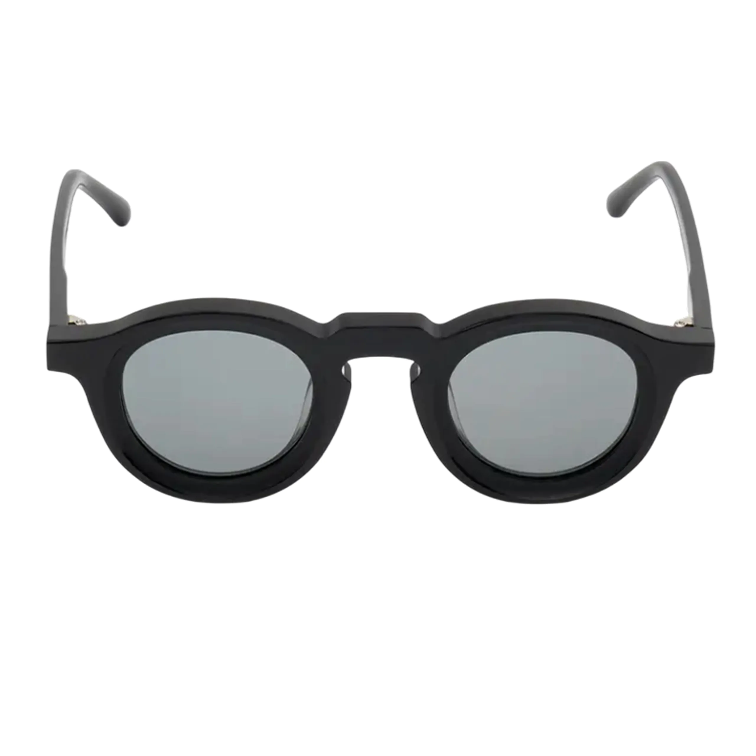 Солнцезащитные очки VOICE в оправе из японского ацетата чёрного цвета. Круглые серые линзы, арочный мостик, интегрированные носовые упоры, эргономичные дужки с титановым каркасом.