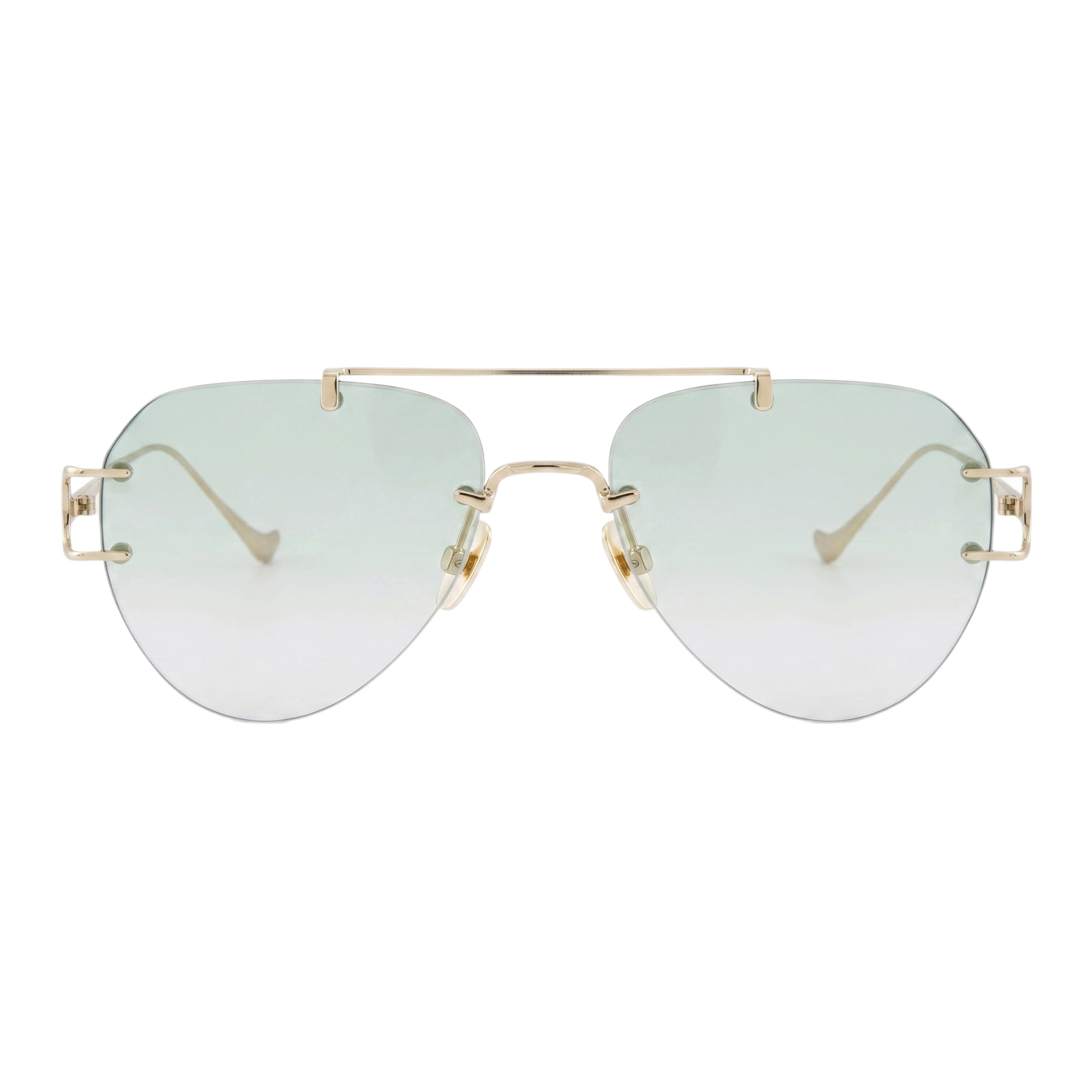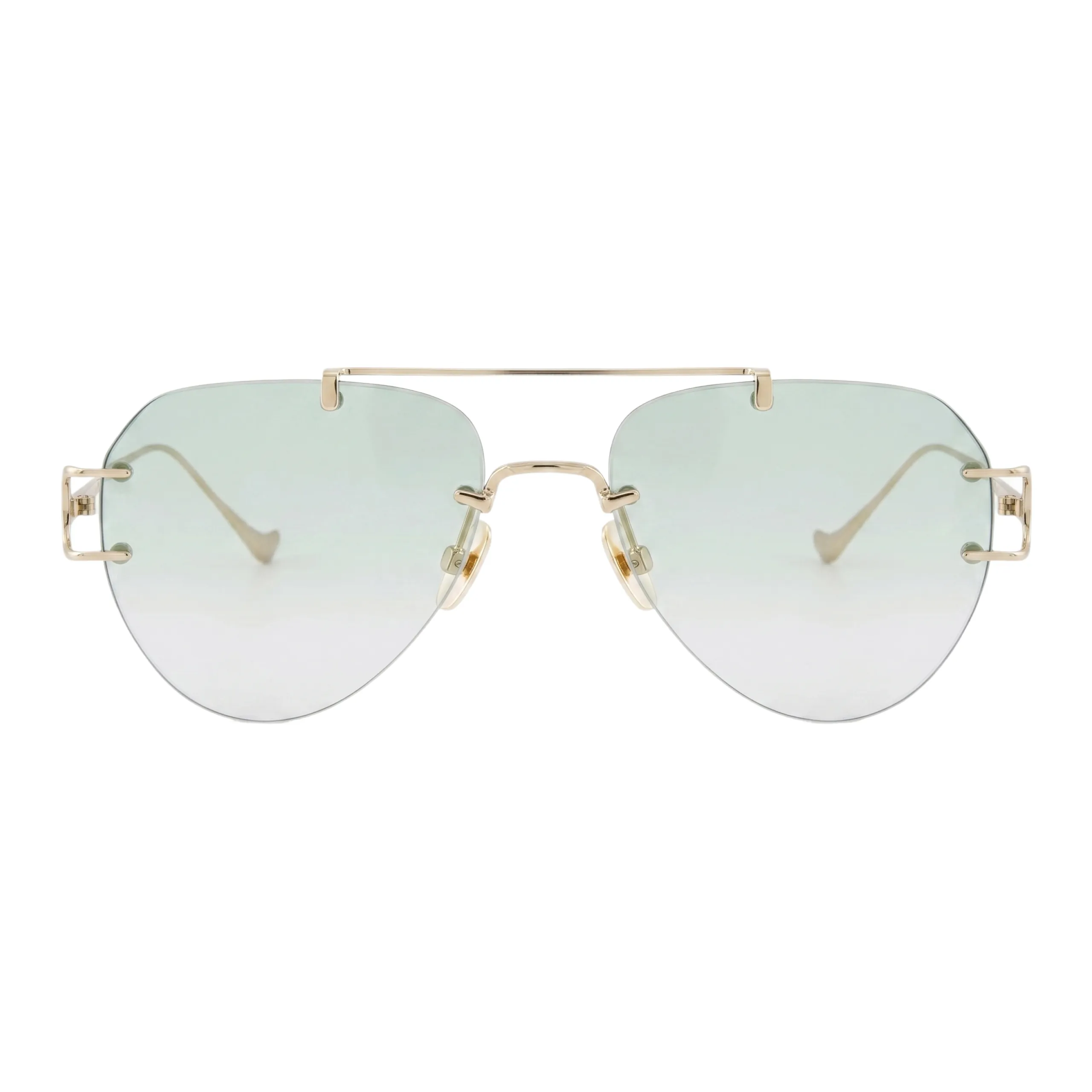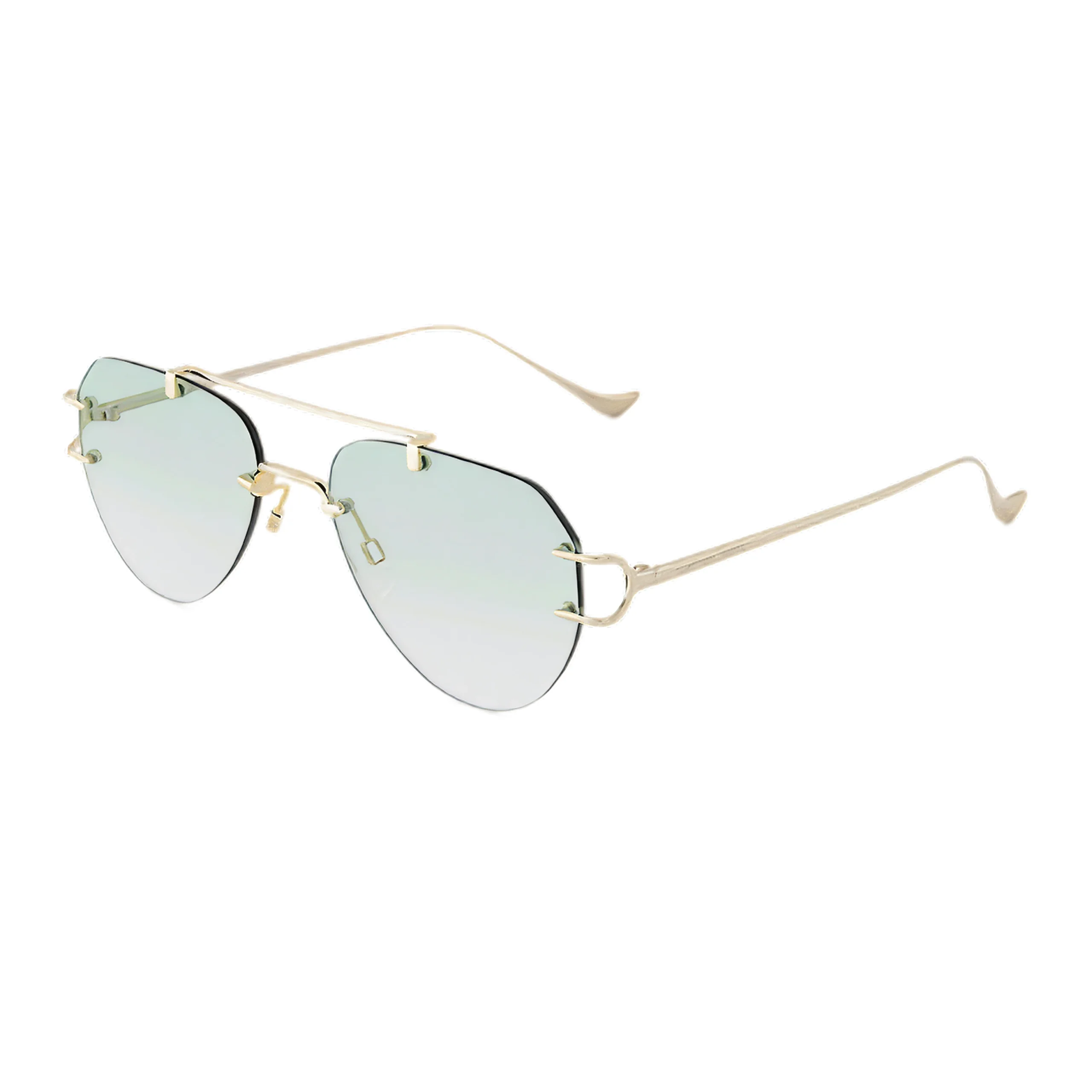 Главная интрига оправы кроется в необычной системе креплений. Тонкий металлический каркас в оттенке классического теплого золота не просто удерживает линзы, а эффектно обхватывает их по краям с помощью акцентных ювелирных клипс. Прямая верхняя линия (sweatbar) задает лицу четкую, графичную структуру, которая безупречно балансирует легкий, стремящийся вниз каплевидный силуэт. Полупрозрачный мятно-зеленый градиент работает как идеальный освежающий бьюти-фильтр — он стирает следы усталости, подсвечивает кожу и позволяет комфортно носить этот стильный аксессуар даже при неярком свете или в помещении.