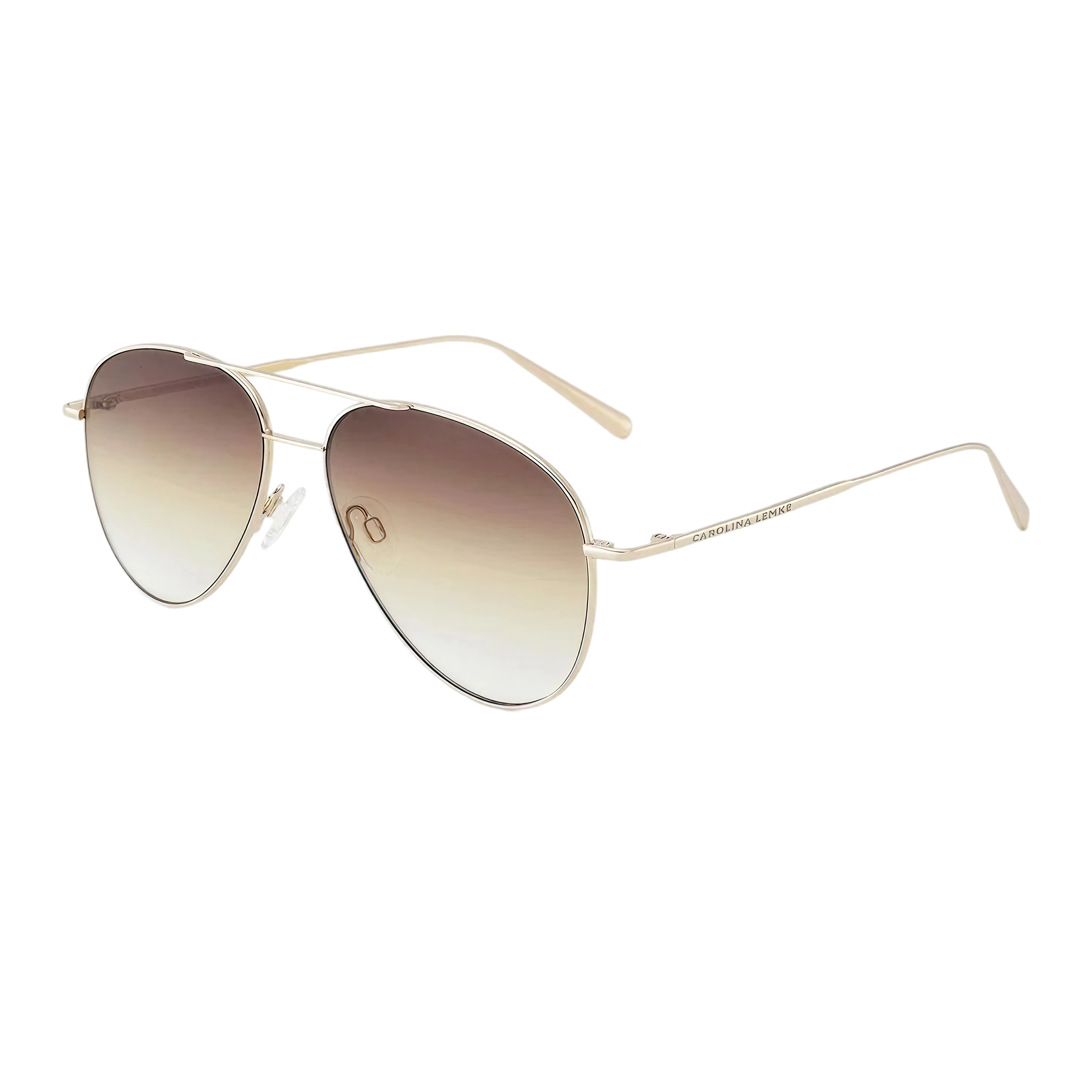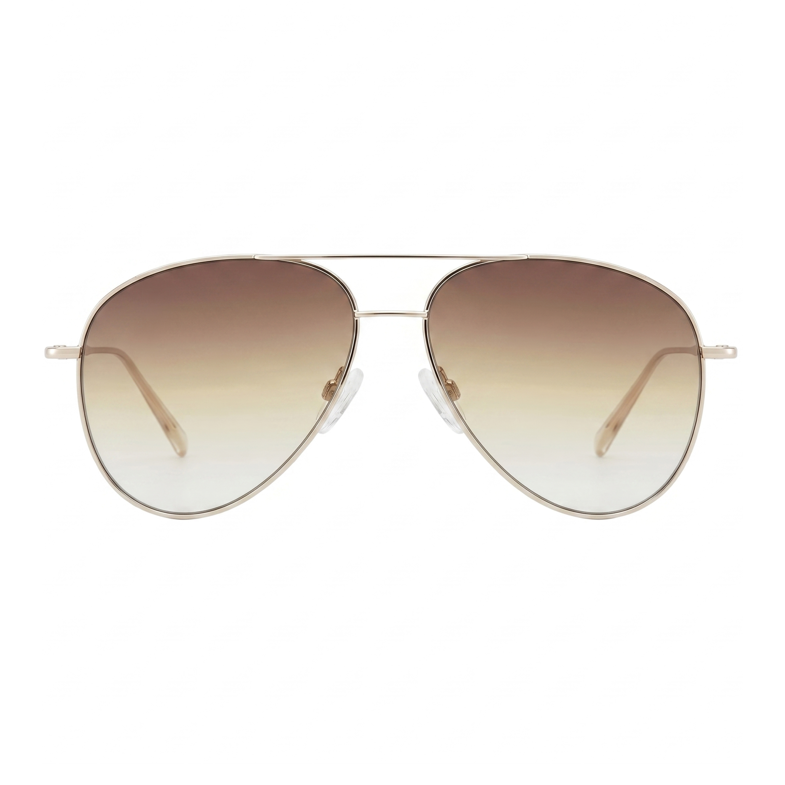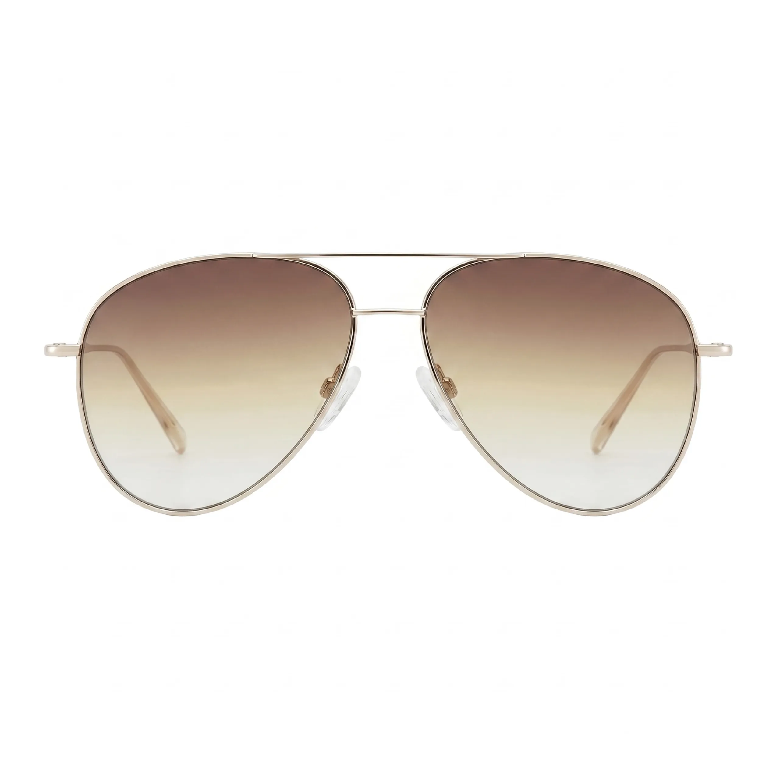 Тончайшая рамочная конструкция с классическим двойным мостом выполнена из сияющего металла в теплом золотистом оттенке. Главное украшение модели — мягкий, обволакивающий градиент линз, плавно переходящий от насыщенного кофейного цвета к прозрачно-янтарному низу. Такая светлая тонировка не только обеспечивает премиальный визуальный комфорт, но и работает как деликатный бьюти-фильтр: она освежает лицо, делает взгляд более открытым и позволяет комфортно чувствовать себя в очках даже при неярком солнечном свете или в помещении.