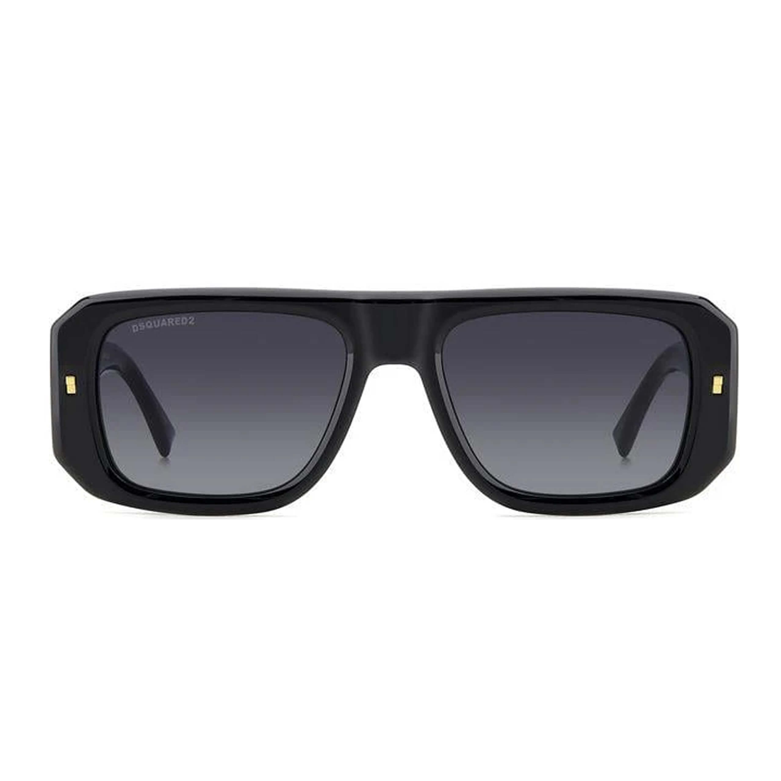 Чистая эстетика бренда Dsquared2: прямоугольный дизайн, мини‑логотип, металлические заклёпки на заушниках и фирменный знак — “maple leaf” на кончиках дужек.