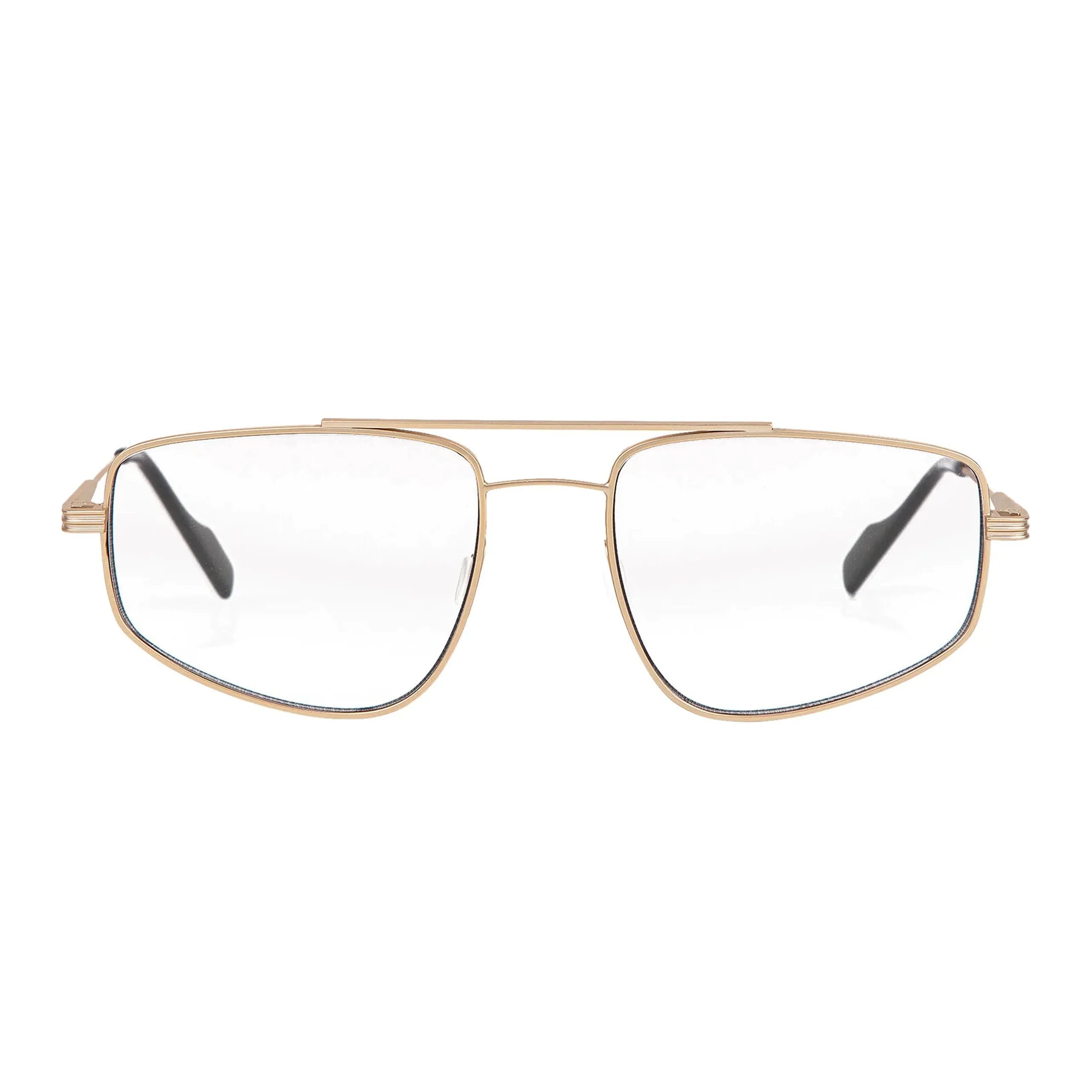 Модель Eyerepublic 19P Posh 56 — современная и элегантная интерпретация классической формы авиатор. Тонкая металлическая оправа в тёплом золотистом оттенке создаёт лёгкий, аккуратный силуэт, а двойная перемычка подчёркивает архитектурность и утончённый характер дизайна.