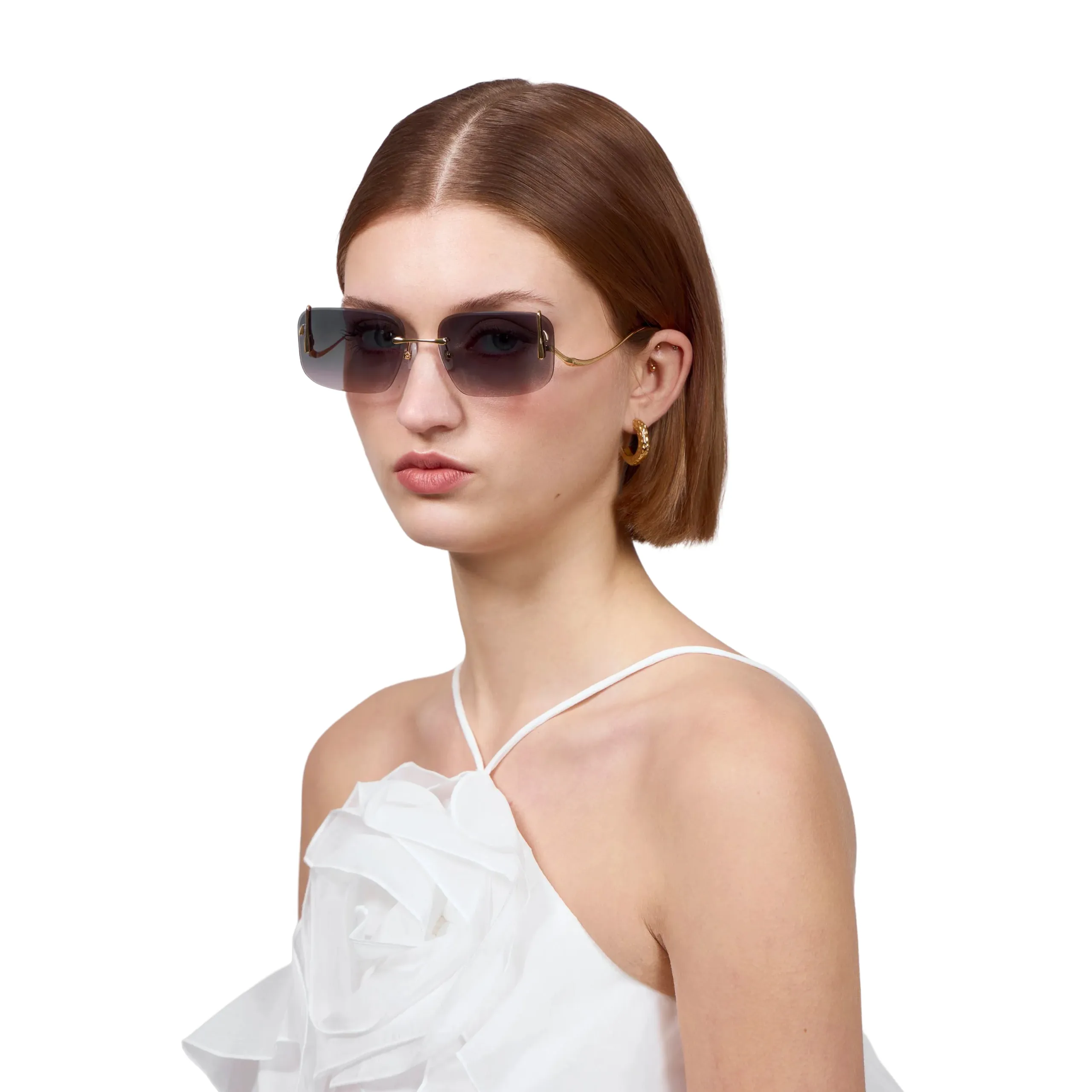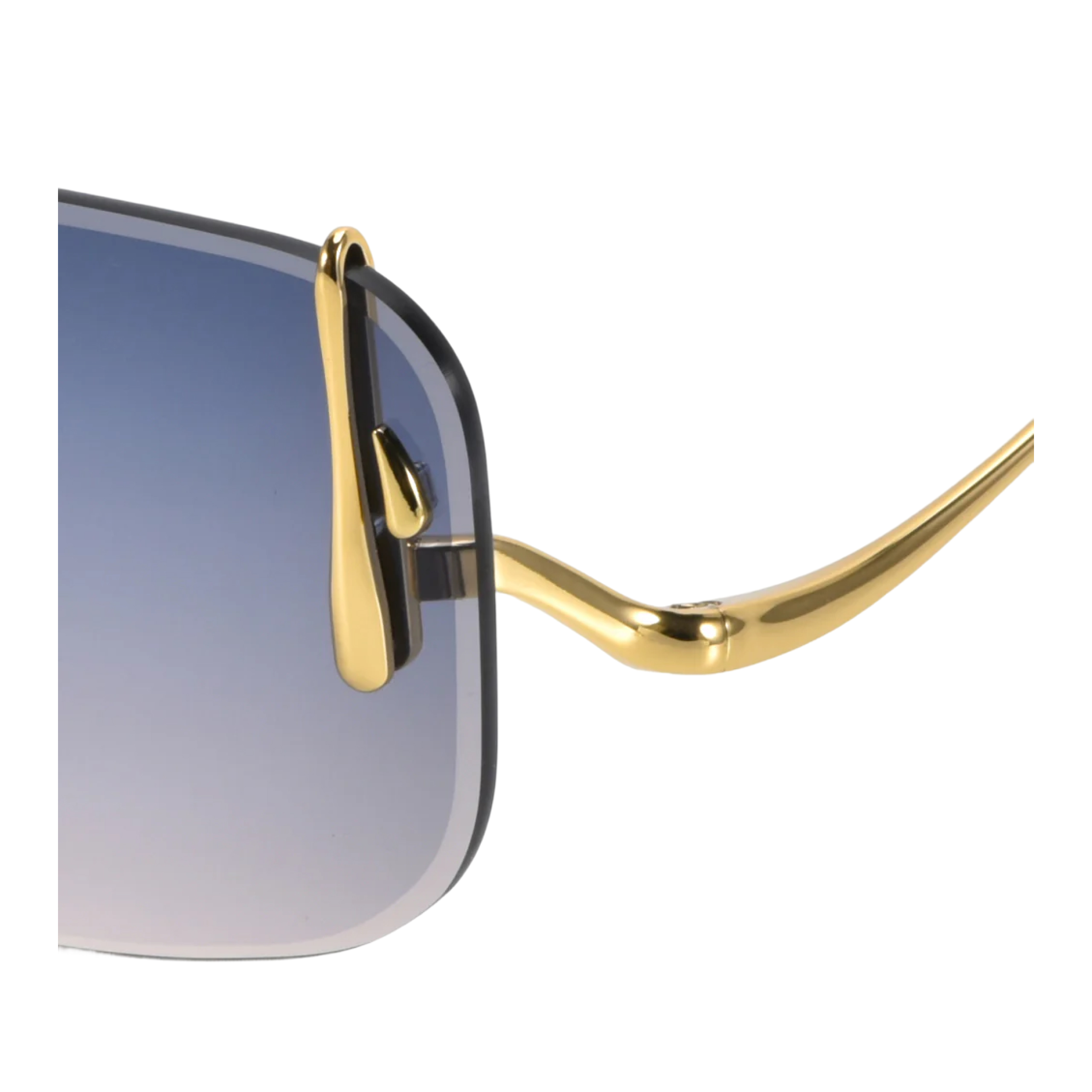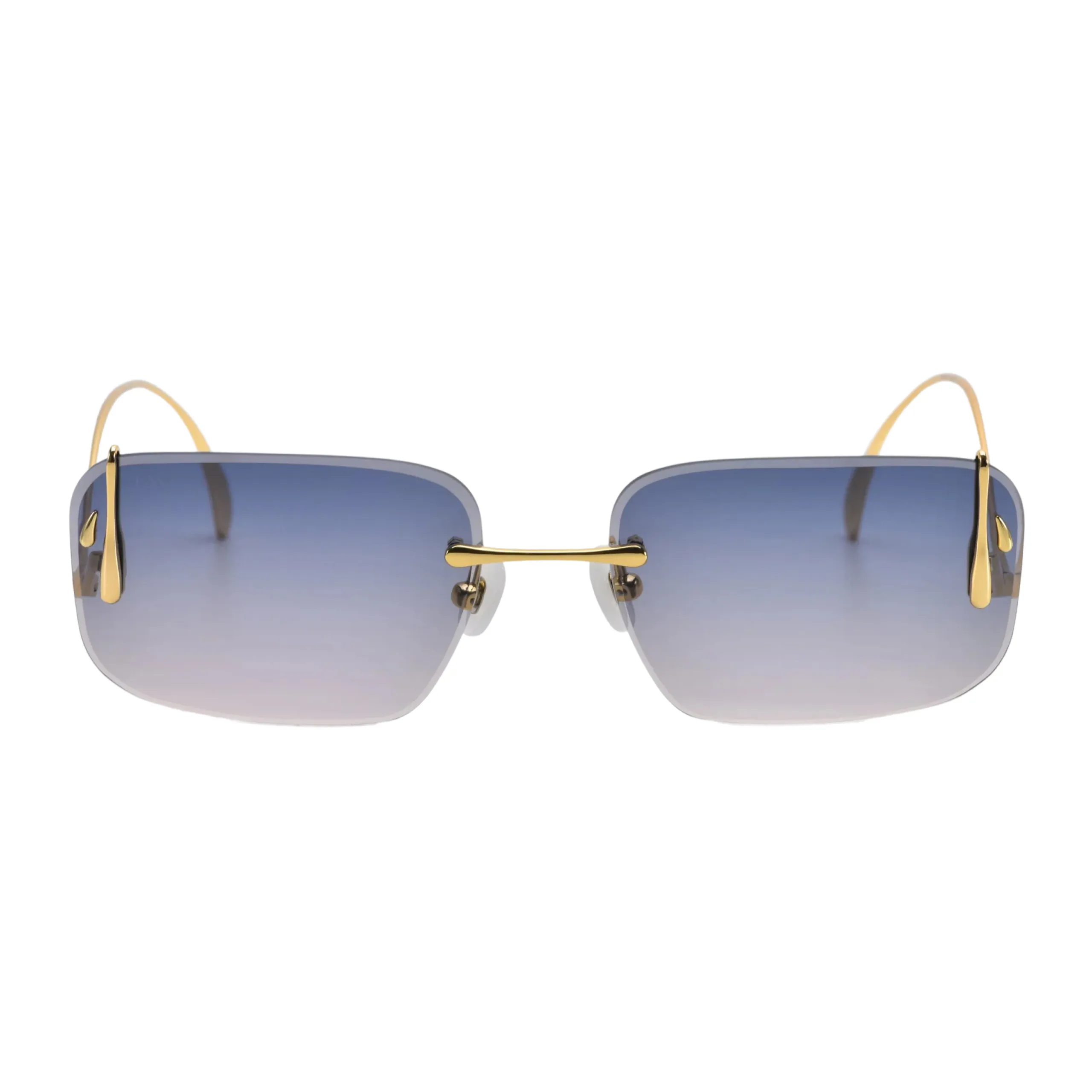 Главная магия этой оправы кроется в воздухе и свете. Полное отсутствие рамки делает конструкцию невесомой, позволяя солировать роскошному градиенту линз — от насыщенного сине-голубого (напоминающего драгоценный топаз) к абсолютно прозрачному. Но истинное произведение искусства здесь — это боковые золотые крепления дужек. Они выполнены в виде скульптурных, обтекаемых капель «расплавленного» металла, которые изящно обнимают линзу по краям. Это очки, которые с легкостью заменят массивные серьги и станут главным магнитом для взглядов.