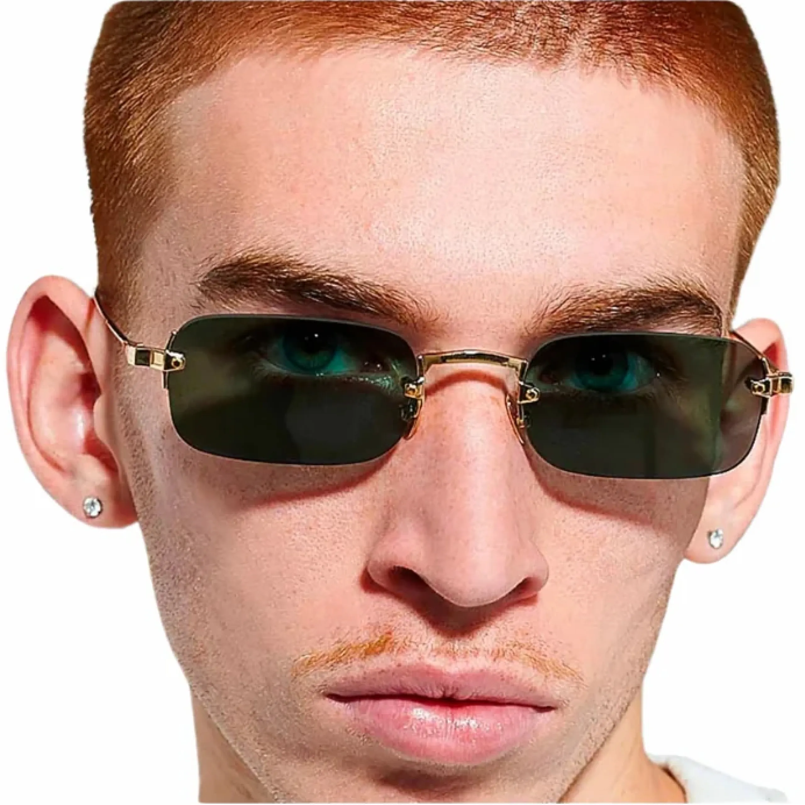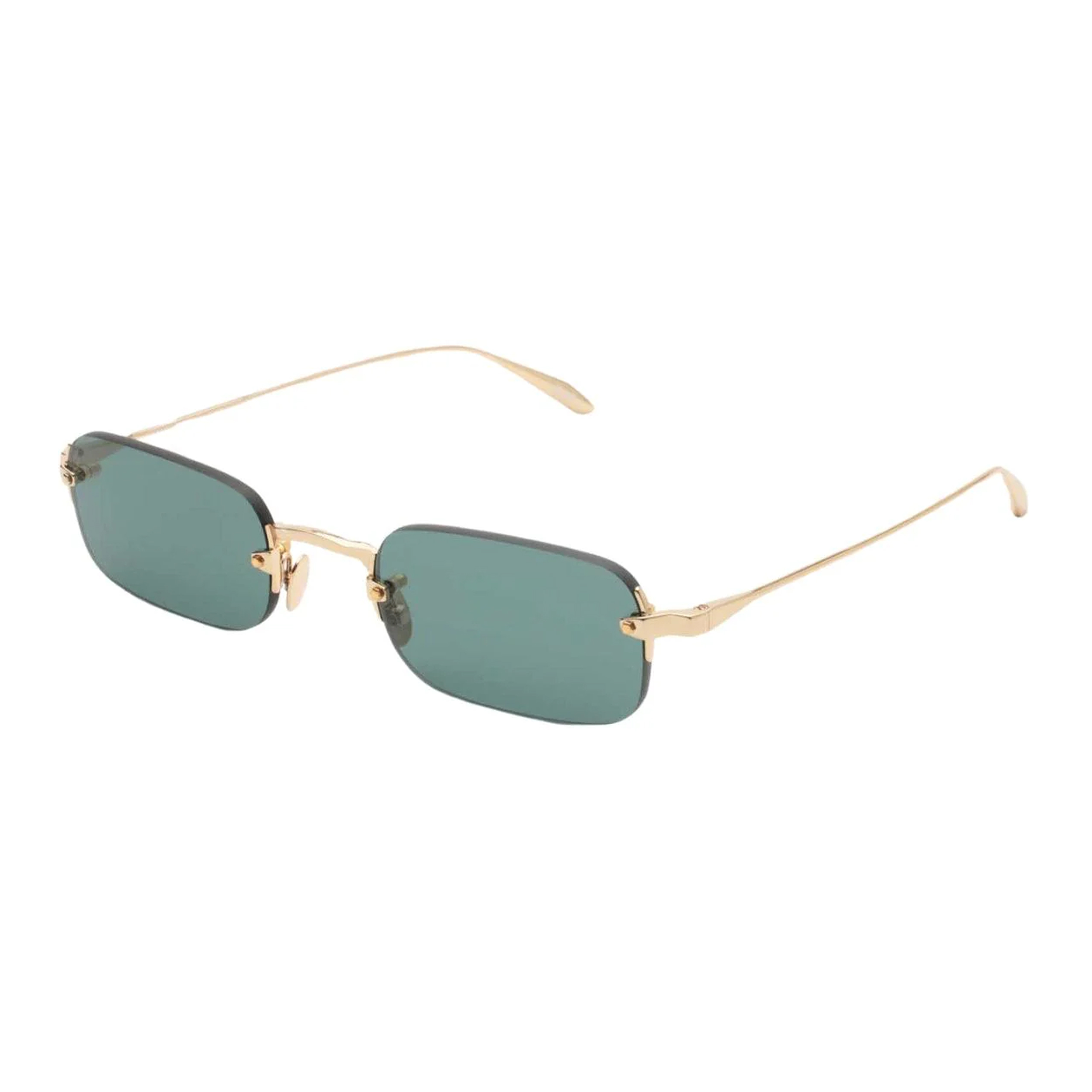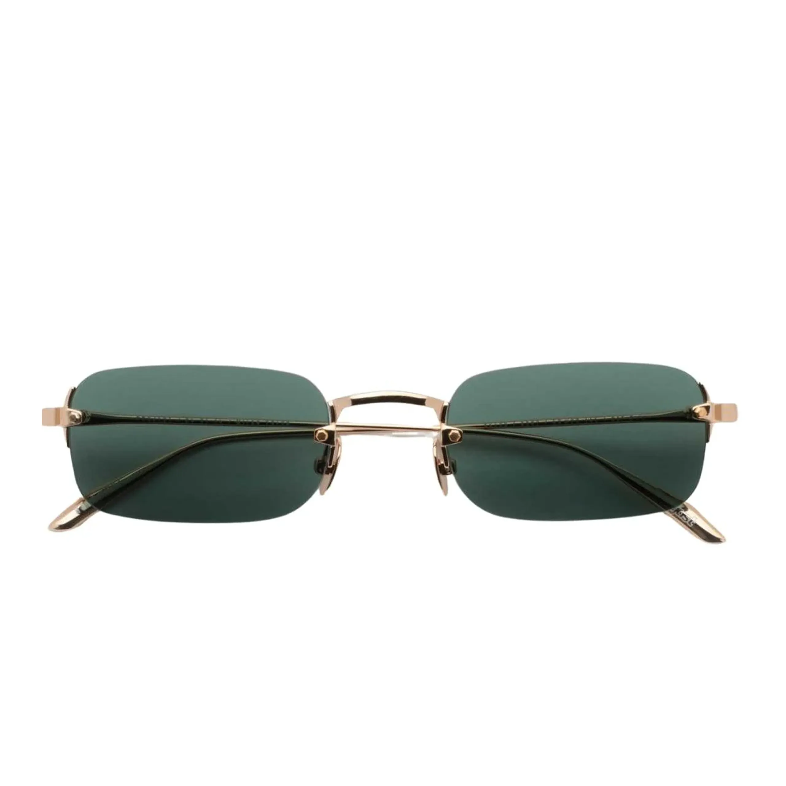 Как и в светлой версии, эта модель делает ставку на легкую деконструкцию, но в цветовом решении 02 она обретает более строгое и авторитетное звучание. Узкие прямоугольные линзы выполнены в глубоком темно-зеленом оттенке — это реверанс в сторону традиционной премиальной оптики, который здесь работает на невероятном контрасте с дерзкой Y2K-формой. Акцентные открытые винты и структурные элементы моста из теплого золотистого металла выразительно пронизывают темное стекло, выступая в роли самостоятельного ювелирного украшения. Эти очки надежно скрывают взгляд, создавая вокруг своего владельца ауру кинематографичной загадочности и абсолютной уверенности.