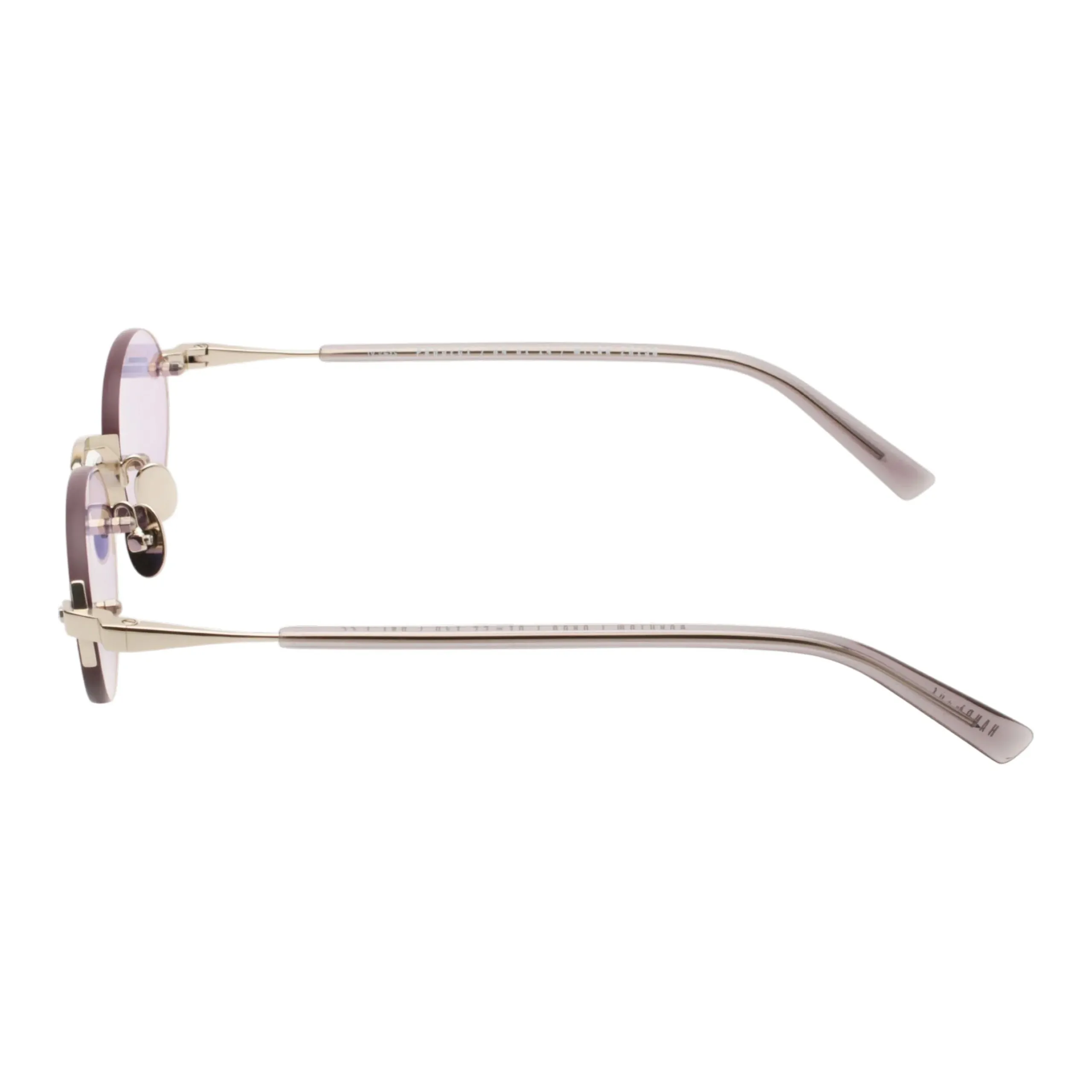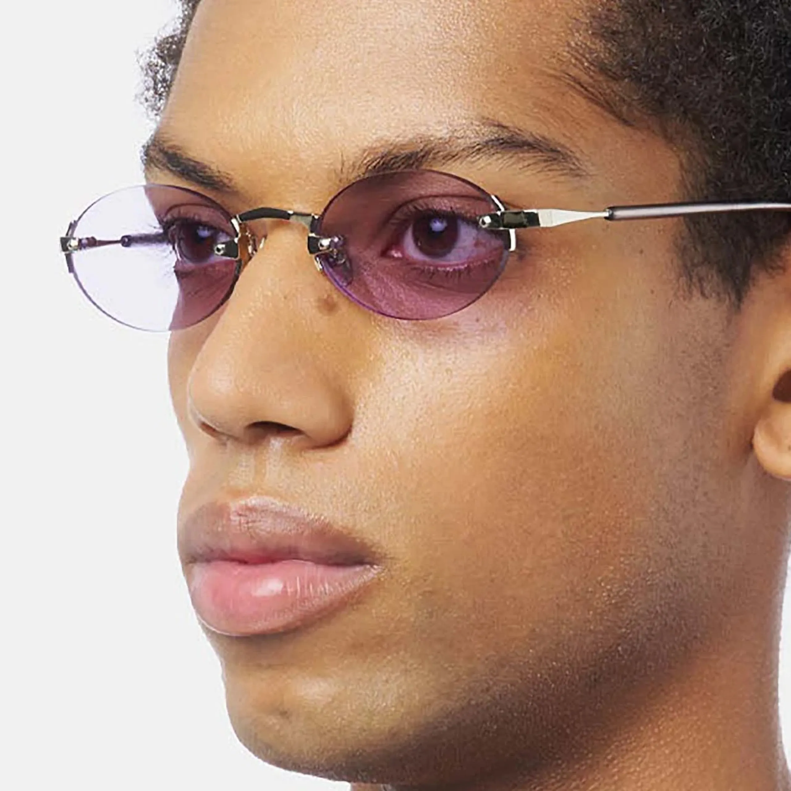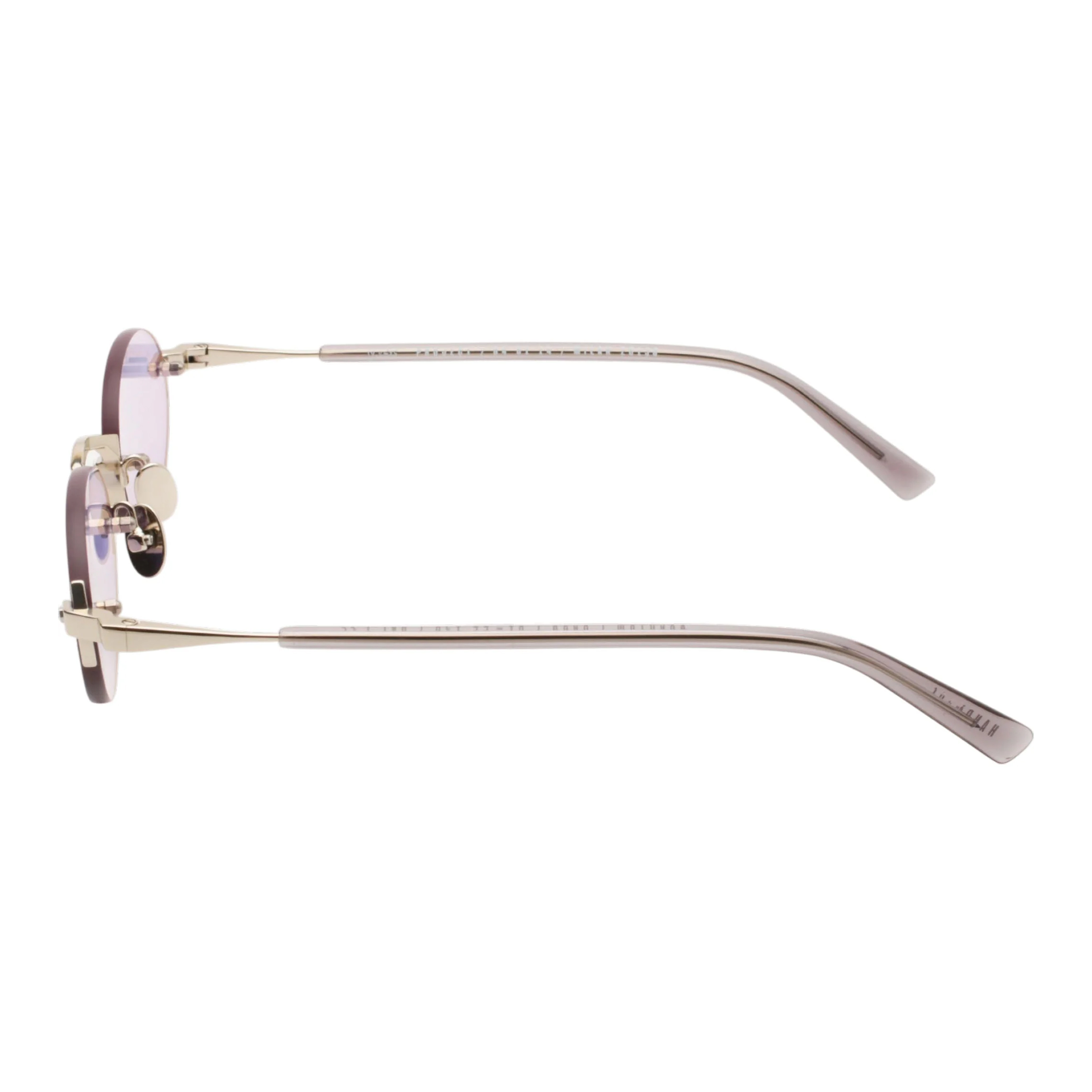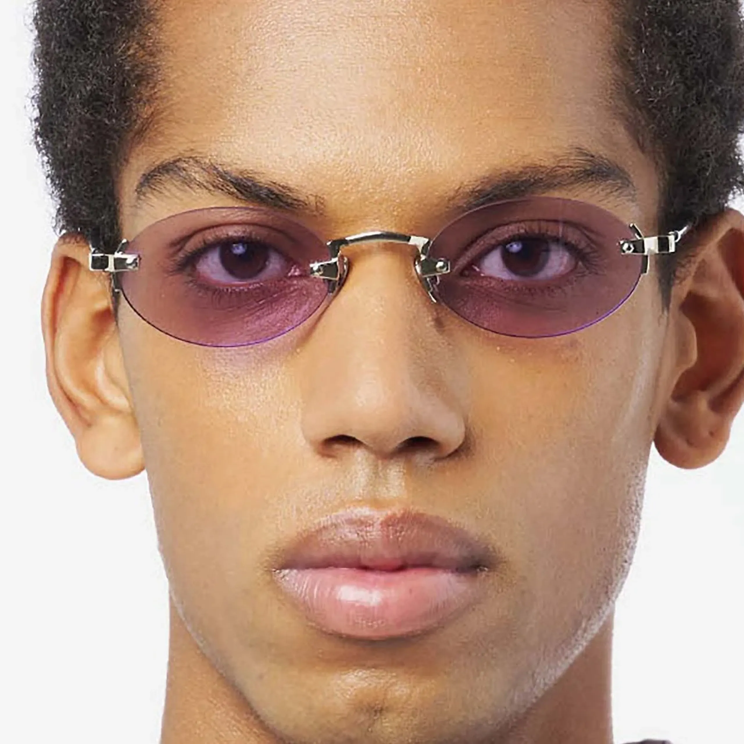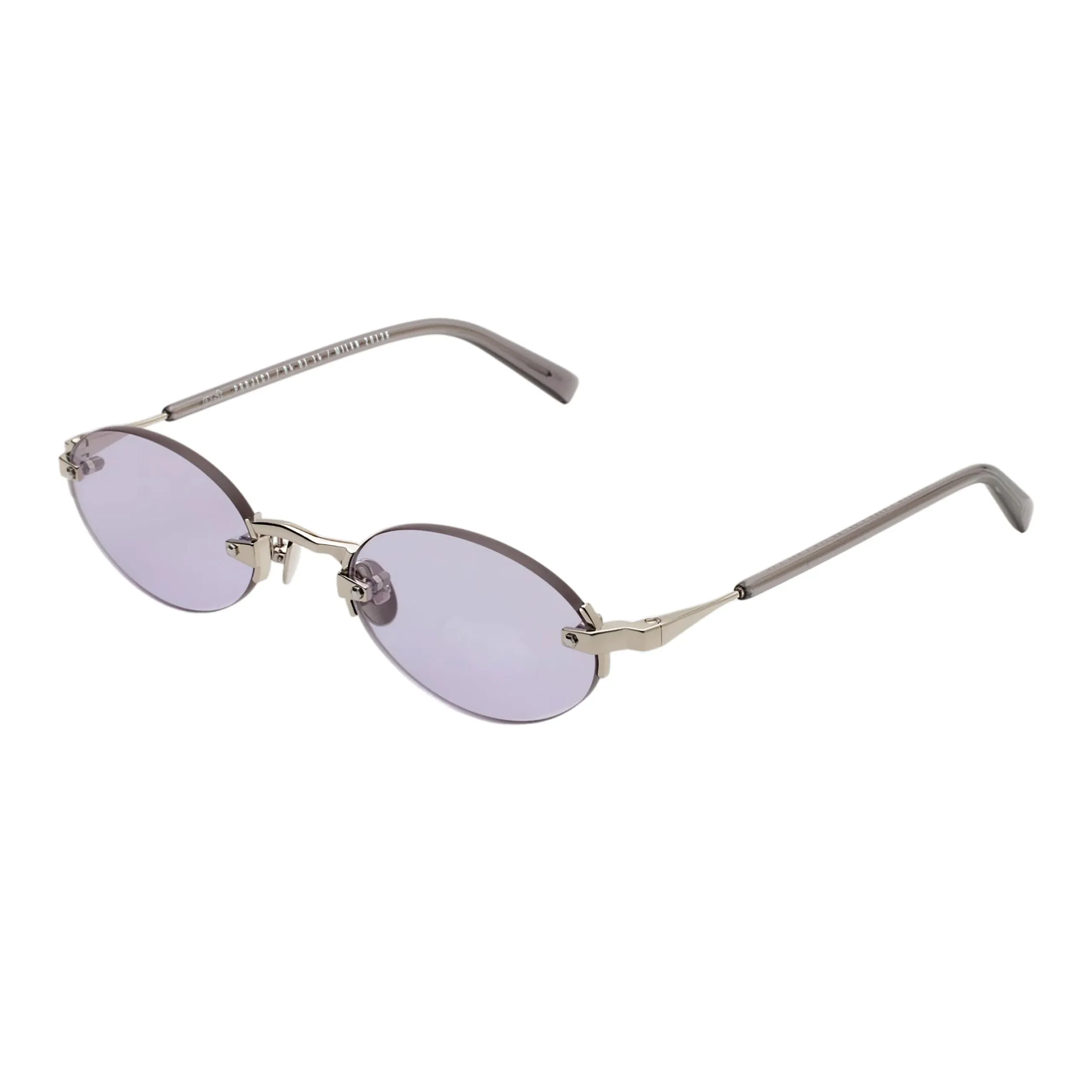 Главный нерв дизайна задают открытые винты и фигурные крепежные элементы из прохладного серебристого металла, которые смело пронизывают стекло насквозь. Эта техничная, сырая деталь блестяще контрастирует с мягкой формой линз и их невероятно красивым, полупрозрачным лиловым (лавандовым) оттенком. Такая светлая тонировка работает как изысканный бьюти-фильтр, освежая взгляд и позволяя не расставаться с любимым аксессуаром даже на вечерних светских раутах или в помещении.