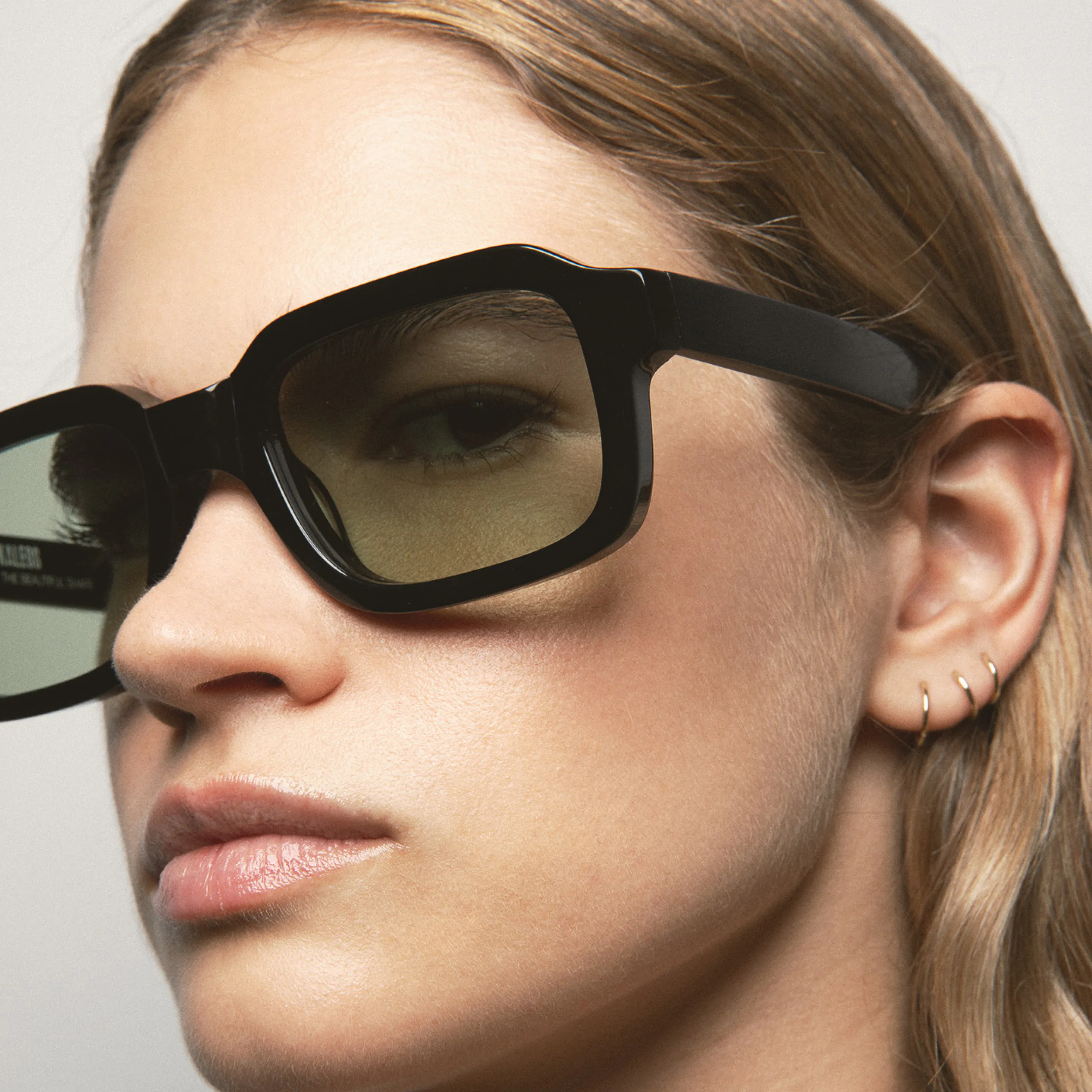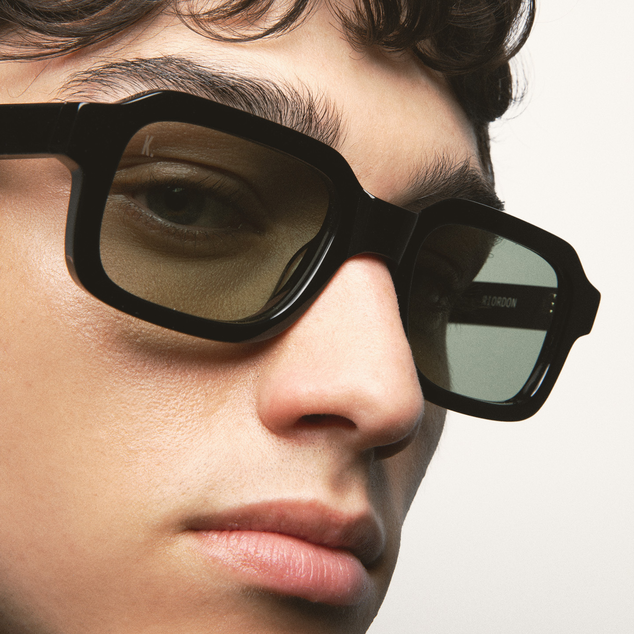 Геометричная прямоугольная оправа с характерной широкой линией верха создаёт выразительный архитектурный силуэт. Плотный чёрный ацетат подчёркивает графичность формы, а полупрозрачные оливково-коричневые линзы смягчают образ и обеспечивают комфортное затемнение. Модель сочетает современный минимализм и заметный акцент, подойдёт для тех, кто выбирает структурный дизайн и чистые линии.