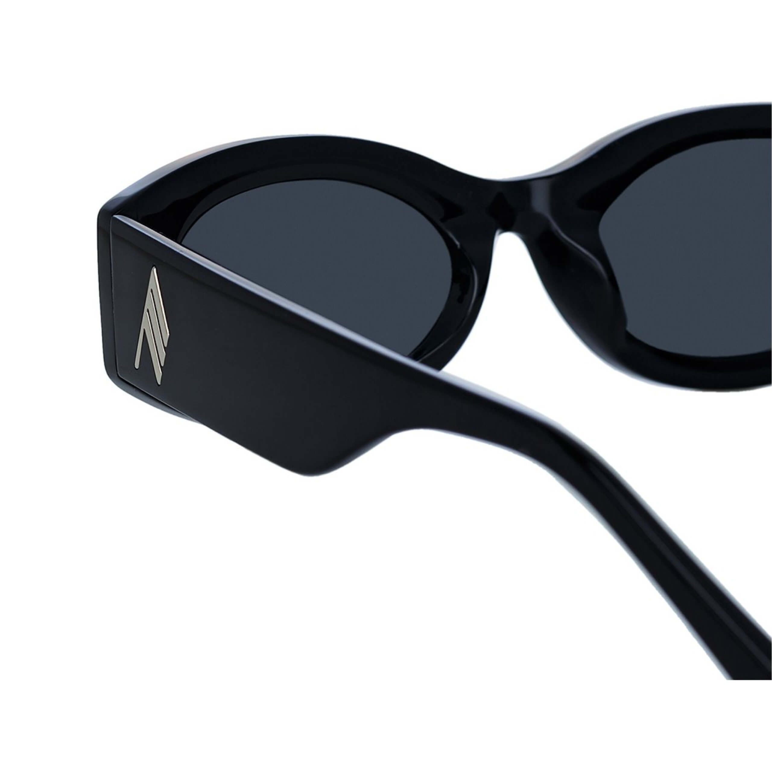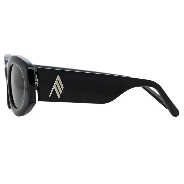 Глянцевая глубоко-чёрная ацетатная оправа создаёт эффект скульптурности и подчёркивает плавные линии модели. Широкие заушники добавляют характерный драматичный акцент, типичный для бренда The Attico.