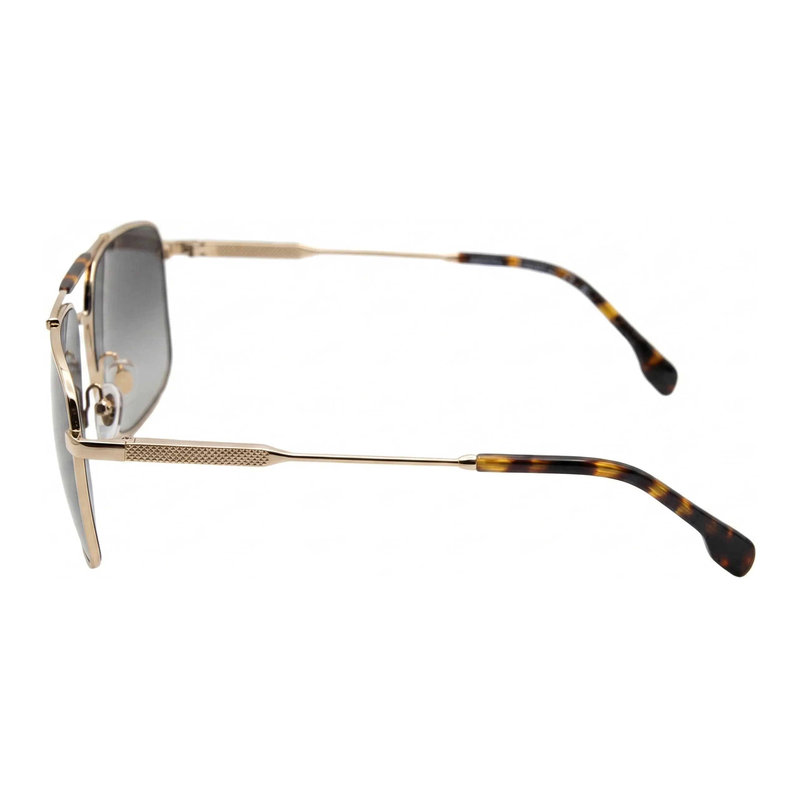 Внимание к деталям выдает исключительное качество исполнения: верхняя планка моста акцентирована вставкой из ацетата черепахового окраса, создавая изысканный визуальный контраст с холодным блеском металла. Заушники украшены тонкой фактурной гравировкой, напоминающей гильоше на корпусах премиальных часов, что добавляет аксессуару тактильной сложности. Серые градиентные линзы не только завершают этот строгий ансамбль, но и гарантируют безупречный оптический комфорт в любых условиях освещения.