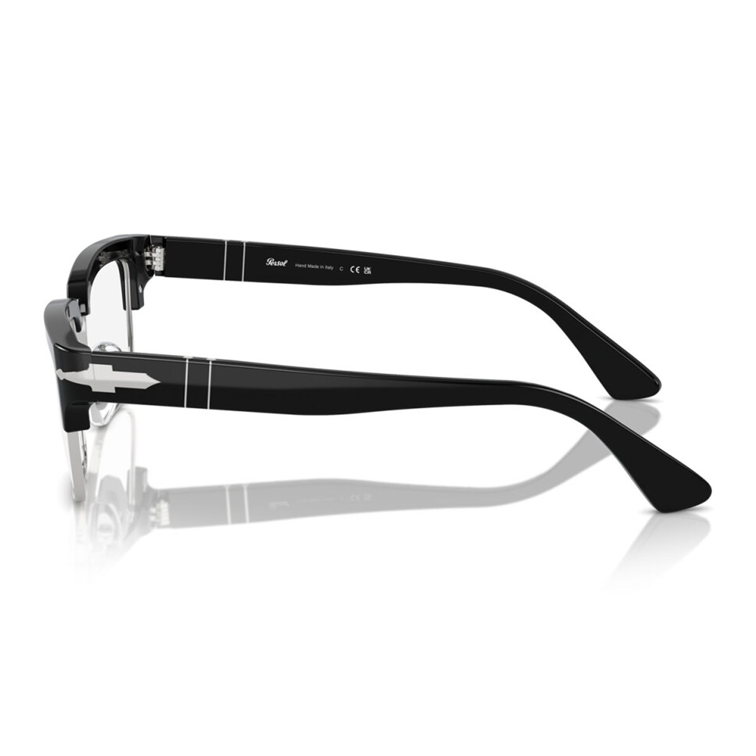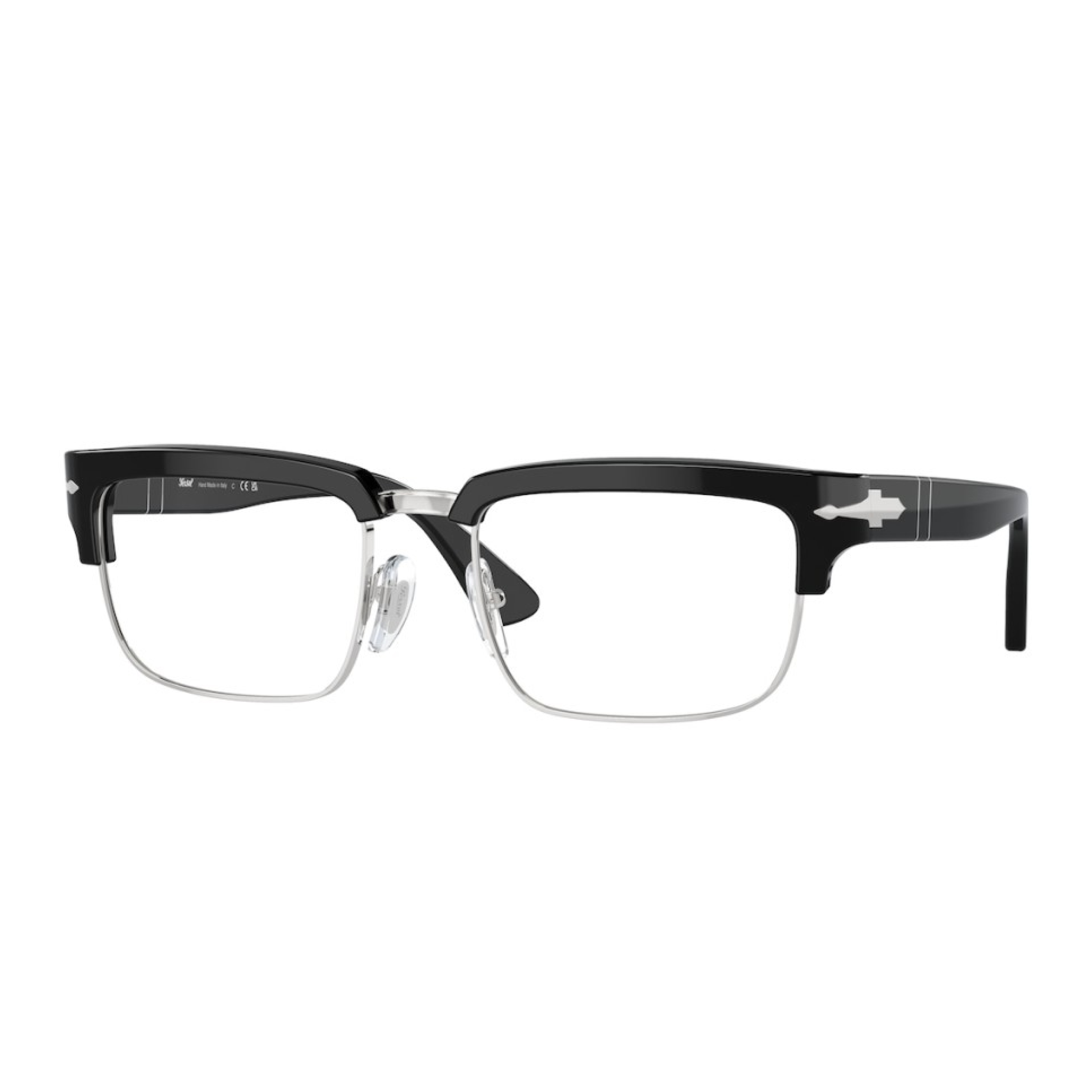 Технологическое совершенство оправы проявляется в безупречном сочетании материалов премиум-класса. Верхняя часть рамки выполнена из черного глянцевого ацетата (код 95), прошедшего многоэтапную ручную полировку, а нижний ободок из благородного серебристого металла добавляет образу ювелирную тонкость. Визитной карточкой модели является легендарная серебряная стрела Silver Arrow, интегрированная в шарнирные соединения — символ, подтверждающий ручную сборку и подлинное итальянское происхождение изделия.