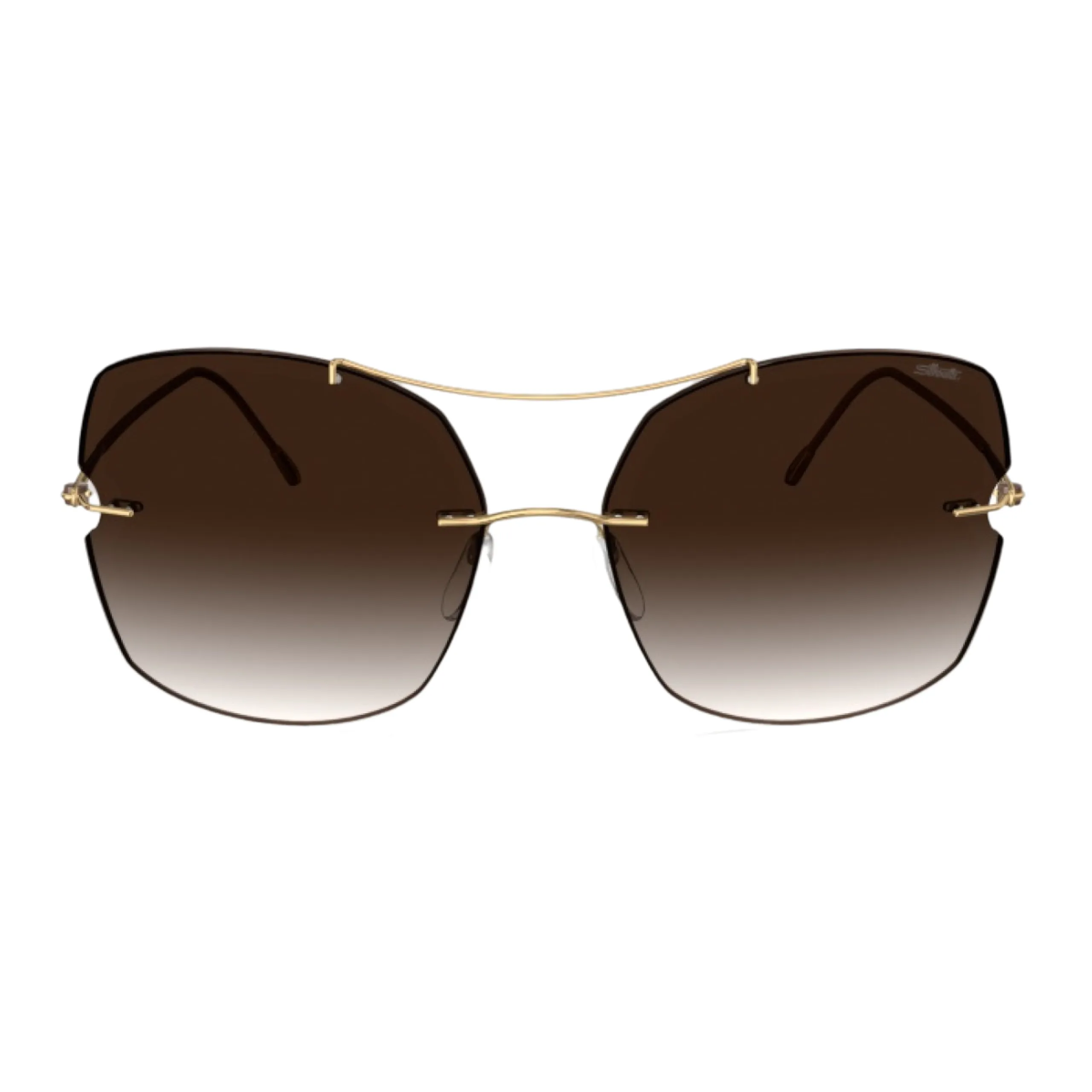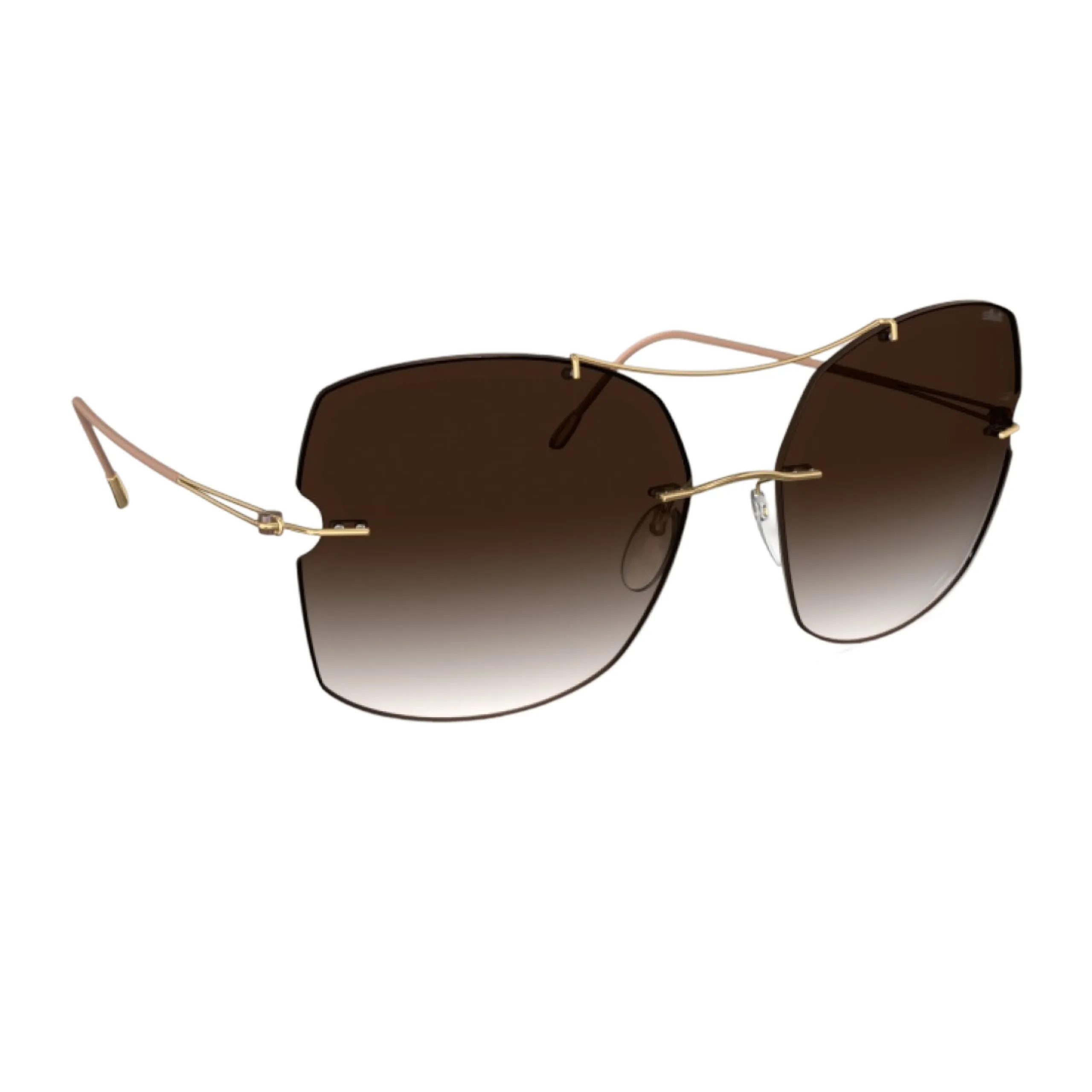 Главная эстетическая находка модели — «парящий» двойной мост. Тончайшая титановая нить теплого золотого оттенка изящно соединяет верхние грани линз, создавая воздушный, но четкий графичный каркас. Сами линзы вырезаны в форме укрупненной, смягченной «бабочки» и залиты благородным кофейно-коричневым градиентом. Эта палитра не только комфортна для глаз, но и накладывает на лицо мягкую, теплую тень, делая образ кинематографичным и дорогим.